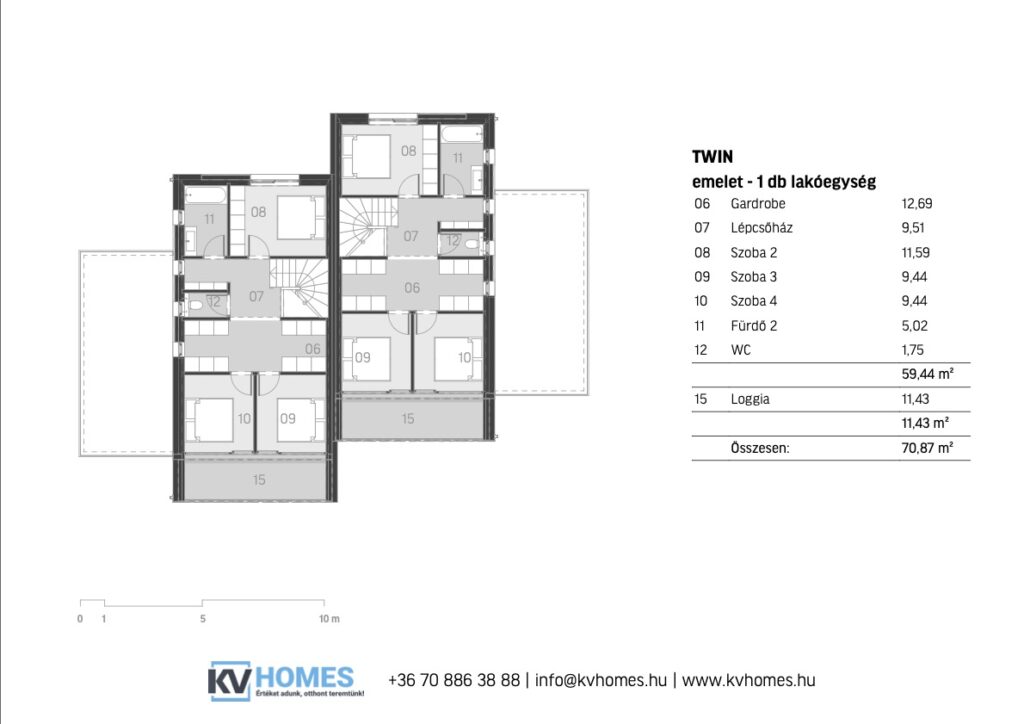 Az épület tömege egységes, mégis két külön életet hordoz. A szimmetria nem csak esztétikai döntés, hanem funkcionális előny: optimalizált alaprajzok, hatékony térkihasználás és költségmegosztás.